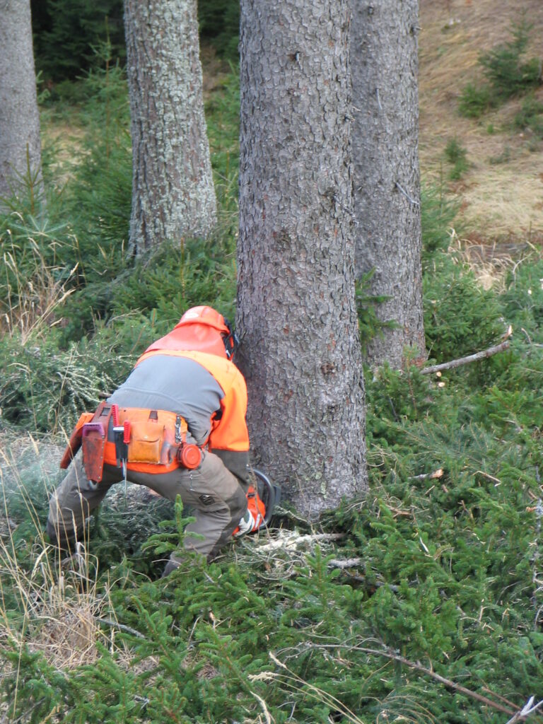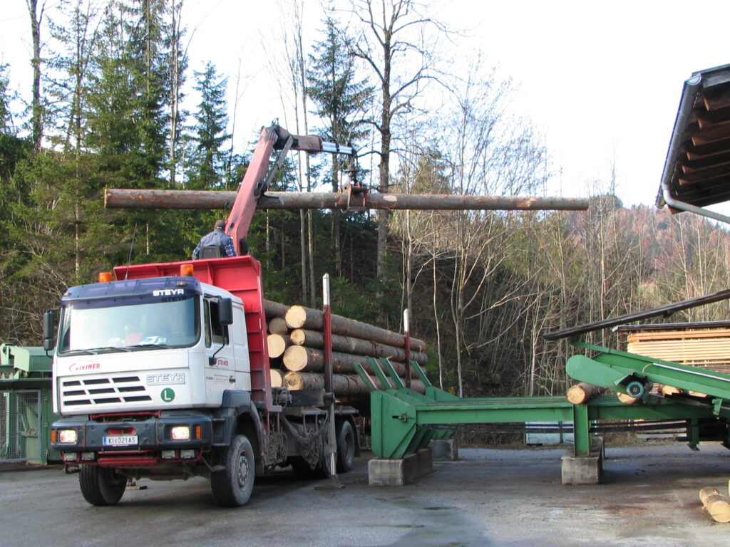 Rundholzversorgung: Das im Umkreis von 30 km, hauptsächlich in den Wintermonaten eingekaufte Rundholz wird von uns im Wald besichtigt. Das Rundholz stammt aus PEFC zertifizierten Wäldern mit nachhaltiger Forstwirtschaft. Bundesforste, Landesforste, private Forstbetriebe und Waldbauern zählen zu unseren Lieferanten. Großteils werden 12 m lange und kleinere Mengen 9 m lange Stämme, generell ohne Stammbloche für die Bauholzproduktion eingekauft. Stammbloche sind oftmals durch ihren unruhigen Wuchs (Krümmung, Wurzelanlauf, Buchs und Schäden durch Wildverbiss) nicht zur Bauholzproduktion geeignet. |